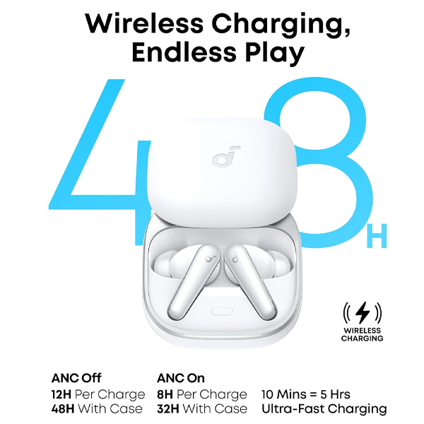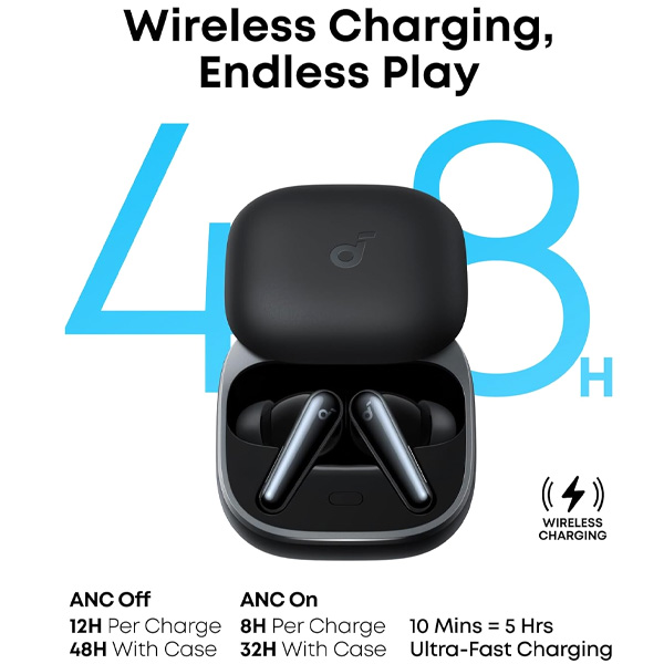 טעינה מהירה ואלחוטית: האוזניות תומכות בטעינה מהירה וטעינה אלחוטית המציעה כ- 5 שעות שימוש בטעינה של כ- 5 דקות בלבד או עד כ- 12 שעות שימוש בטעינה מלאה ו-48 שעות האזנה בשימוש עם מארז הטעינה; כאשר סינון הרעשים פעיל, זמן השימוש יורד ל-8 שעות וכ-32 שעות האזנה בהתאמה;