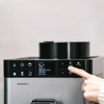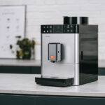 מכונת קפה אוטומטית בעיצוב מודרני וקומפקטי עם מבנה איכותי וקצוות מעוגלים.