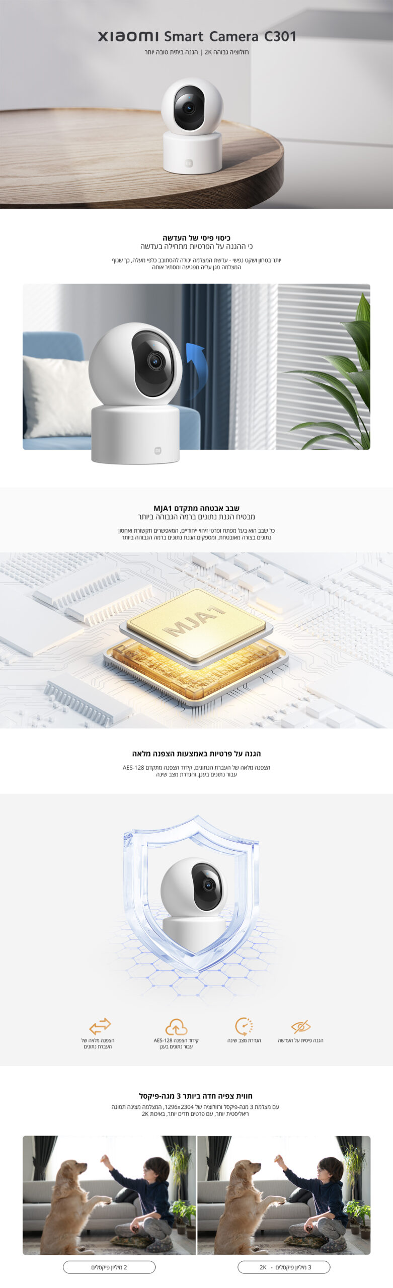 המצלמה Xiaomi Smart Camera C301 היא שדרוג מרשים בתחום מצלמות האבטחה הביתיות, במיוחד למי שמחפש שילוב של איכות תמונה גבוהה, תנועה סיבובית ושליטה חכמה.