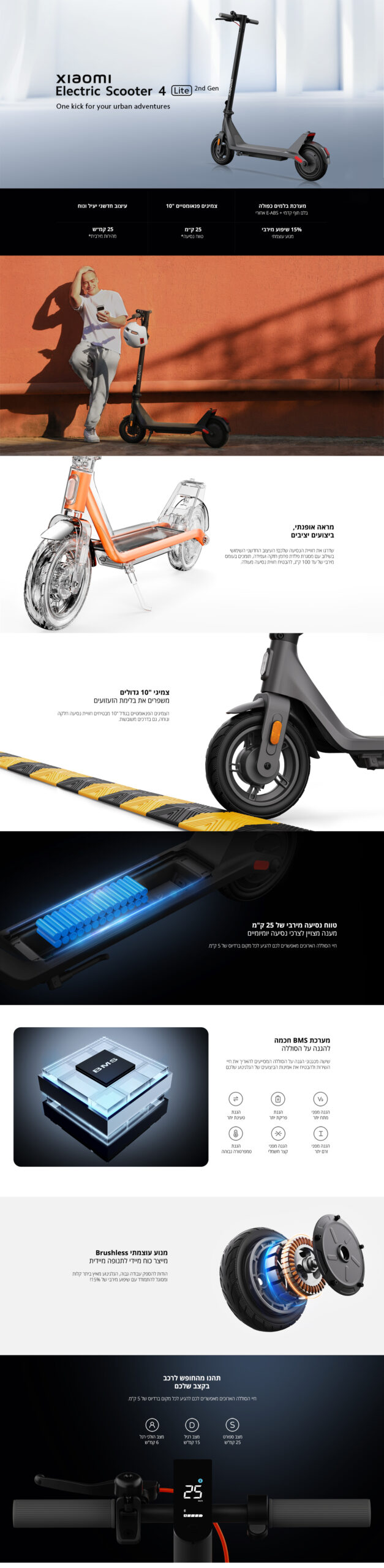 מצבי רכיבה: מצב הולכי רגל 6 קמ”ש | מצב D רגיל עד 15 קמ”ש | מצב ספורט S עד 25 קמ”ש