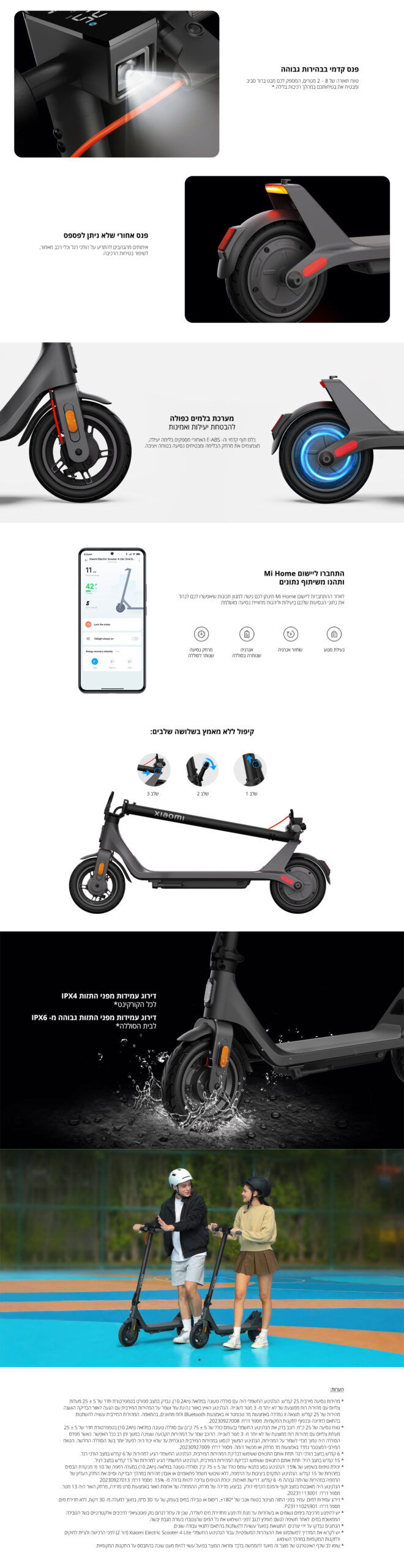 דירוג עמידות בפני מים ואבק – IPX4 לגוף הקורקינט | IPX6 לסוללה