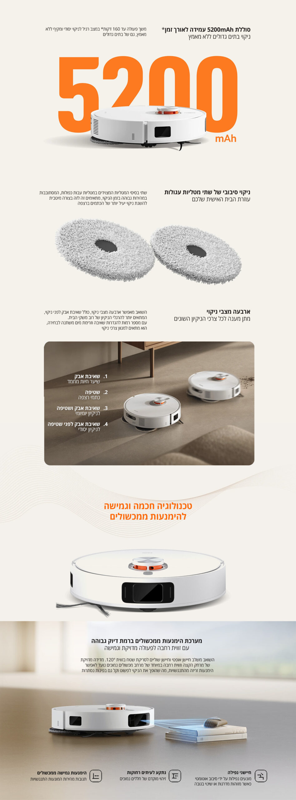 סוללה עוצמתית בקיבולת 5200mAh – עד 160 דקות של עבודת ניקיון רציפה וטעינה בהתאם לצורך תוך כדי עבודה (השואב חוזר לעמדת העגינה לטעינה ובסיום שב להמשך ניקיון בנקודה שהפסיק).