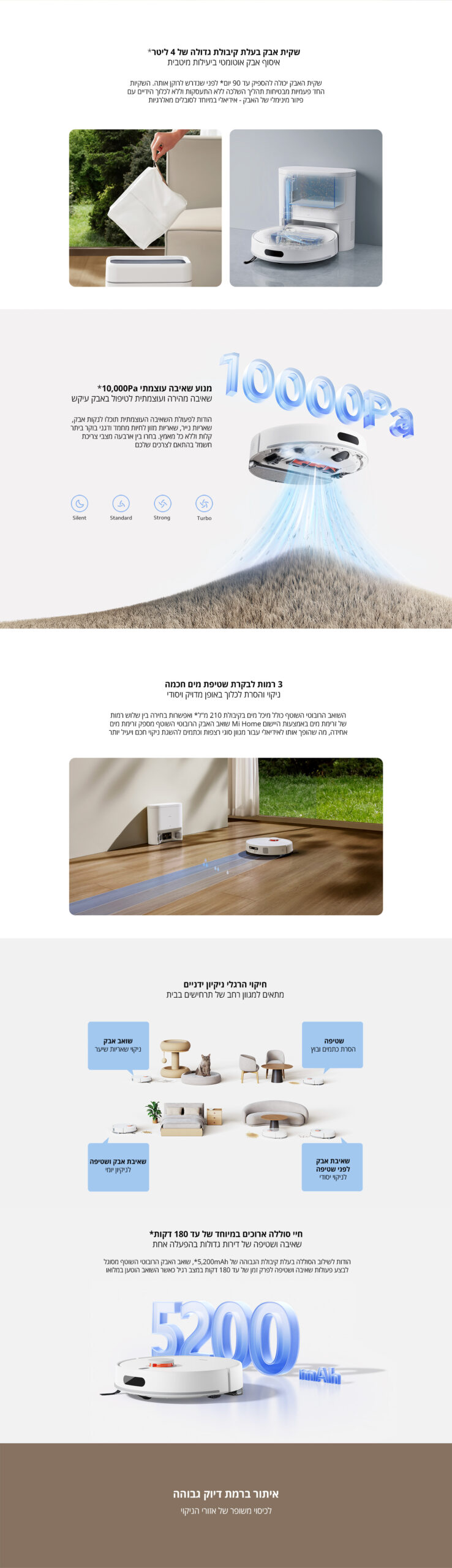 סוללה בקיבולת 5200mAh לשימוש ממושך גם בסביבות מורכבות – סוללת 5200mAh מספקת עוצמה לשואב הרובוטי המספיקה לניקיון דירת 5 חדרים ממוצעת במצב שאיבה סטנדרטי* ועד 180 דקות של זמן עבודה.