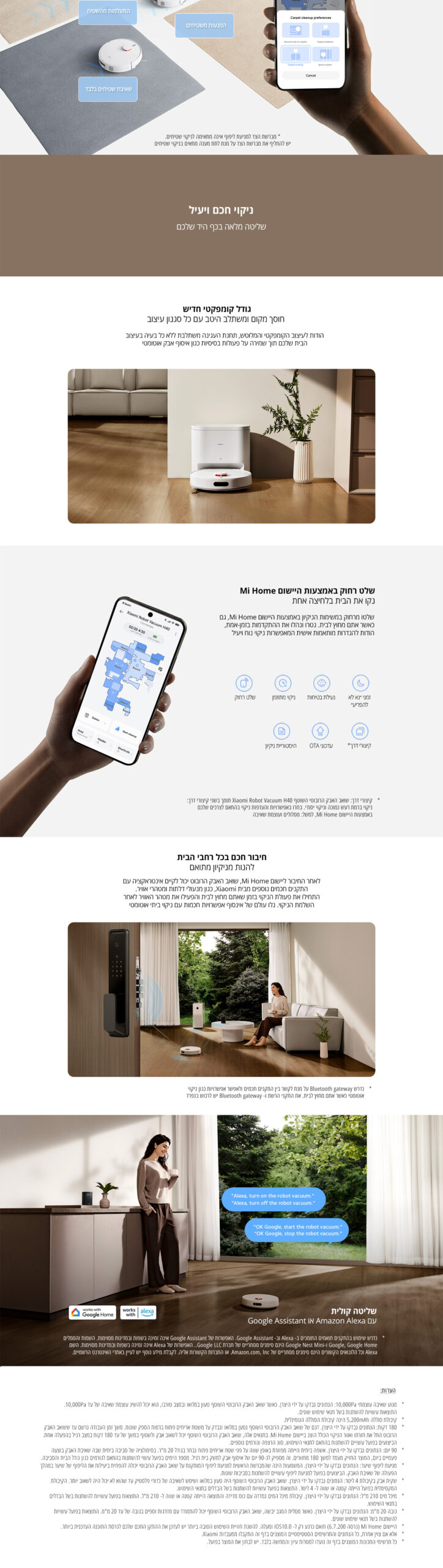 שליטה חכמה באמצעות היישום Mi Home ותמיכה בהפעלה קולית עם אמזון ®Alexa ו- ®Google Assistant – תפעול מלא מרחוק: זיהוי ובחירת חדרים לניקוי, שינוי שמות חדרים, ניקוי אזורים, קיר וירטואלי ואזור מוגבל, עריכת מיקום שטיח, עריכת סוג רצפה, תמיכה במספר מפות למפלסים שונים, תזמון ניקוי ושטיפה, עיצוב רהיטים במפה, הפעלת סצנות חכמות עם התקני IoT בבית, והתראה על הצורך בהחלפת אביזרים מתכלים: מסנן, מברשת ראשית, מברשת צד ומטלית שטיפה.